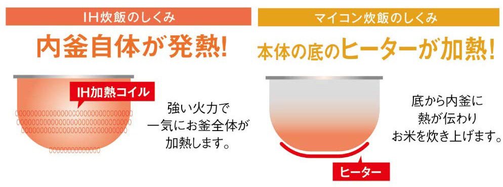 Costo circa 120 euro, con un sistema di riscaldamento ad induzione che cuoce più velocemente e in modo uniforme, sprigionando, secondo quanto sostiene il produttore, l’aroma del riso ed esaltandone il sapore. (Vedi disegnino qui sotto che spiega le differenze tra suihanki “classico” con piastra riscaldante inferiore e questo nuovo modello con riscaldamento ad induzione in cui tutto il “pentolino” si riscalda.)