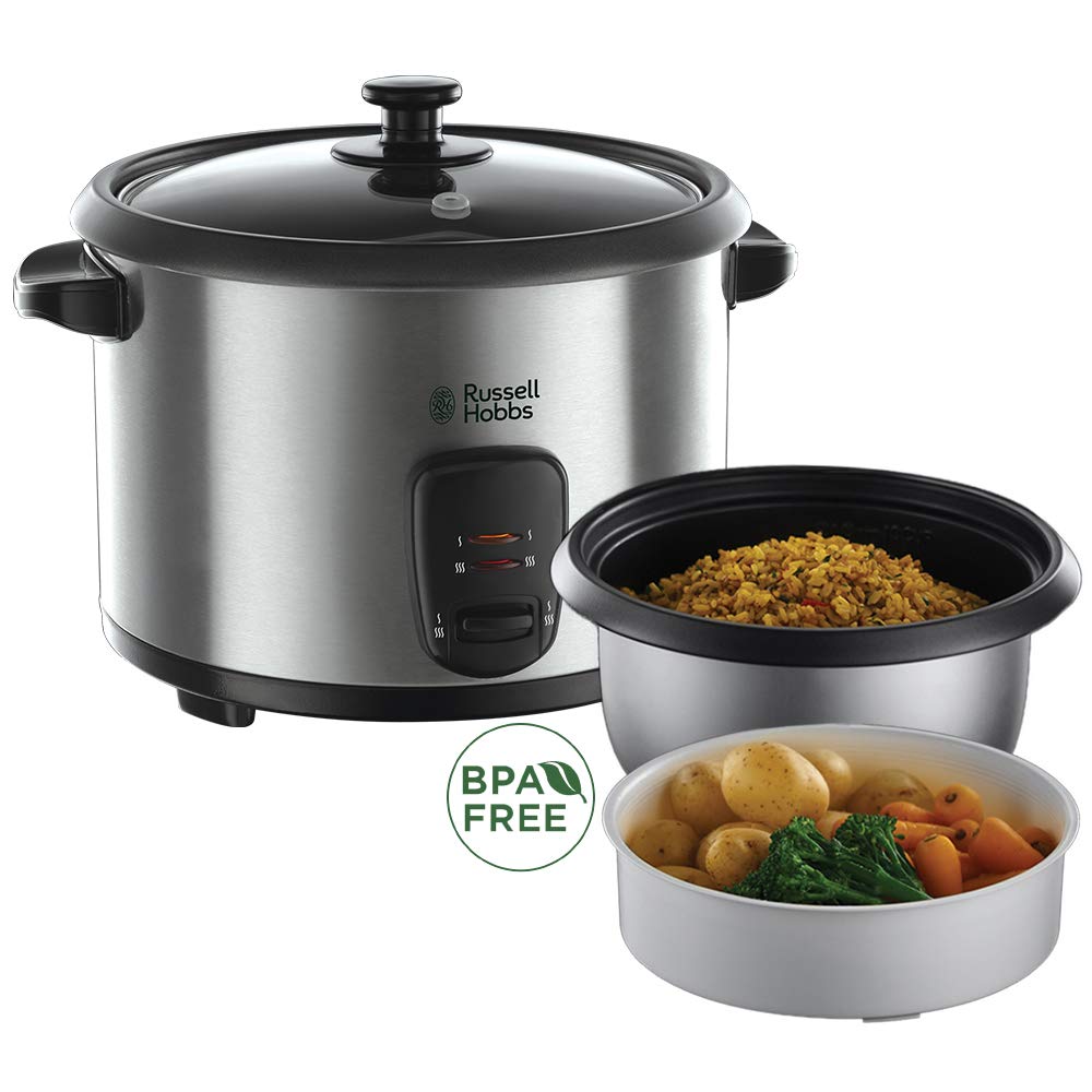 Altro cuociriso con molte buone recensioni (oltre 200). Con contenitore antiaderente rimovibile, vassoio per la cottura a vapore di pesce/verdure, spatola e misurino inclusi. Funzione mantenimento calore terminata la cottura, potenza 700 W, capacità: 1.8 litri / 10 tazze. Materiale: acciaio, coperchio in vetro.