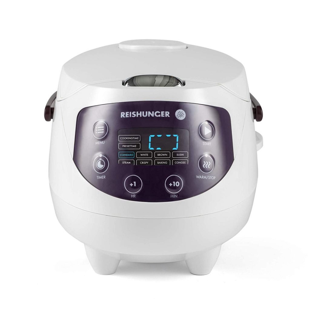 Cuociriso con poche ma buone recensioni, capacità circa 2 litri (per 10 persone), modello con scritte in inglese e spina inglese (ma solitamente nella scatola viene fornita anche la spina italiana). Le dimensioni sono 46 x 33 x 32 cm e il peso si aggira intorno ai 5 kg, quindi va bene per cucine spaziose e famiglie numerose. In dotazione anche cestello per cottura a vapore. 8 programmi di cottura. Cucina anche porzioni contenute per 2/3 persone.