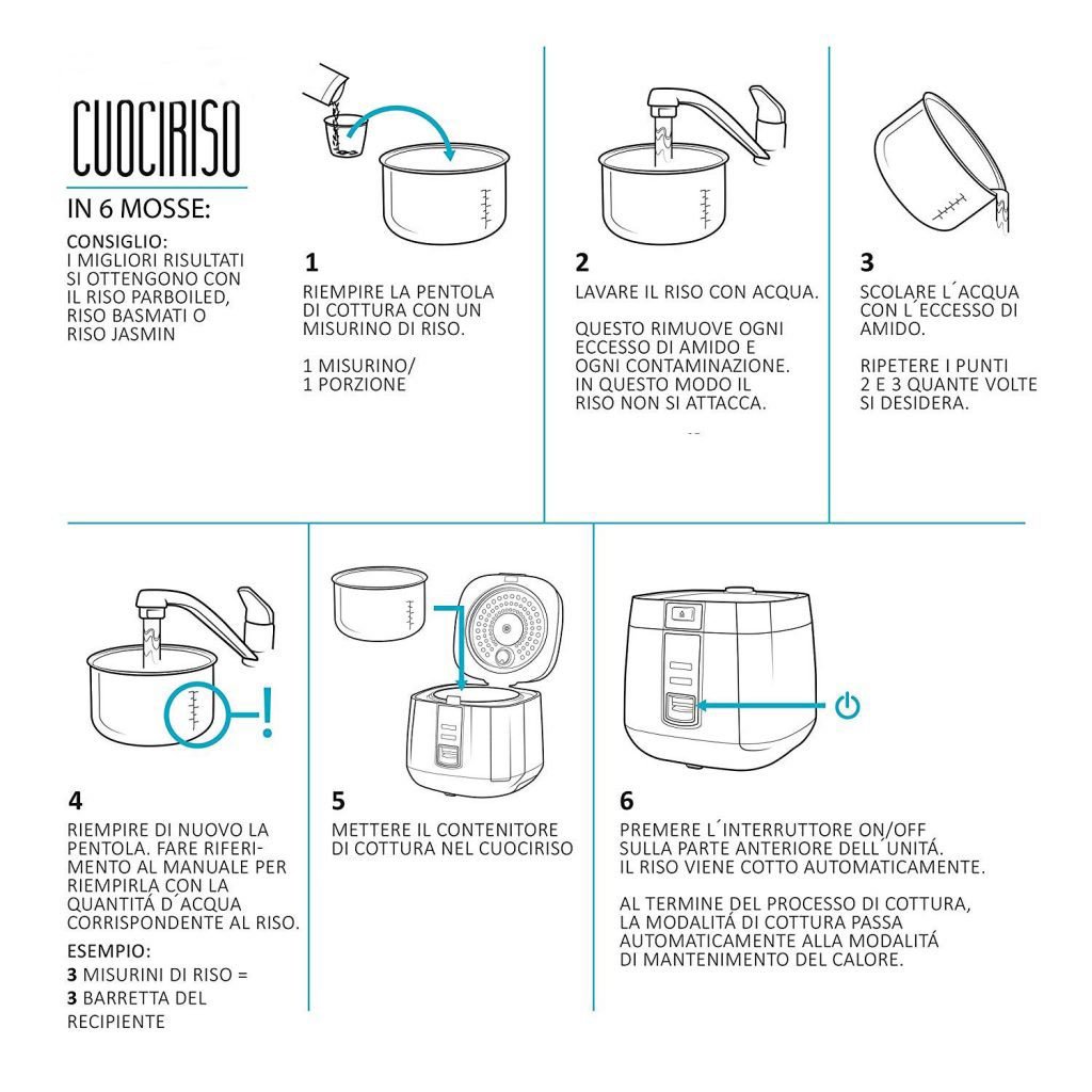 - IDEALE PER SINGLE O COPPIE Capacità di 3,5 tazze di riso crudo (0,6 litri) – sufficiente per 1-3 persone (è disponibile anche il modello più capiente, 1,5 litri, al prezzo di 135 euro circa. Qui il link.)